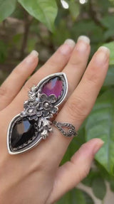 This sterling silver statement ring captures the balance of light and shadow—a dual-stone design featuring teardrop amethyst and black onyx (stone sizes 19×14 & 18×13). Intricately sculpted silver flowers and maple-like leaves create a flourishing bridge between the two gems, uniting their energies in a single botanical design. Set within polished, elongated bezels, this piece is a talisman for spiritual clarity and grounded strength, symbolizing natural harmony and the radiant power of the universe.
