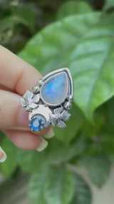 This sterling silver moonstone ring captures the magic of a night garden—a luminous teardrop moonstone with Kyanite accents (stone sizes 14×10 & 5×5) glowing with celestial light. A vibrant sapphire rests between two intricately sculpted silver leaves, their detailed veins echoing the forest's natural beauty. Set in a sleek pointed bezel with polished silver orbs, this piece is a talisman for guidance and clarity, symbolizing intuition, growth, and the quiet magic of nature.