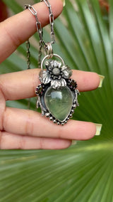 Step into the enchanted realm of the forest with our "Whispering Woods" Prehnite Pear Pendant. Crafted with care from 925 sterling silver, it echoes the tranquil whispers of nature's embrace. At its heart lies a serene prehnite gemstone, a verdant oasis amidst the forest's depths. Delicately adorned with a sterling silver flower and small sparkling mystic topaz. Let this pendant be your companion on journeys through the whispering woods, where every rustle and flutter tells a story of life's enduring beauty and wonder.